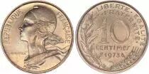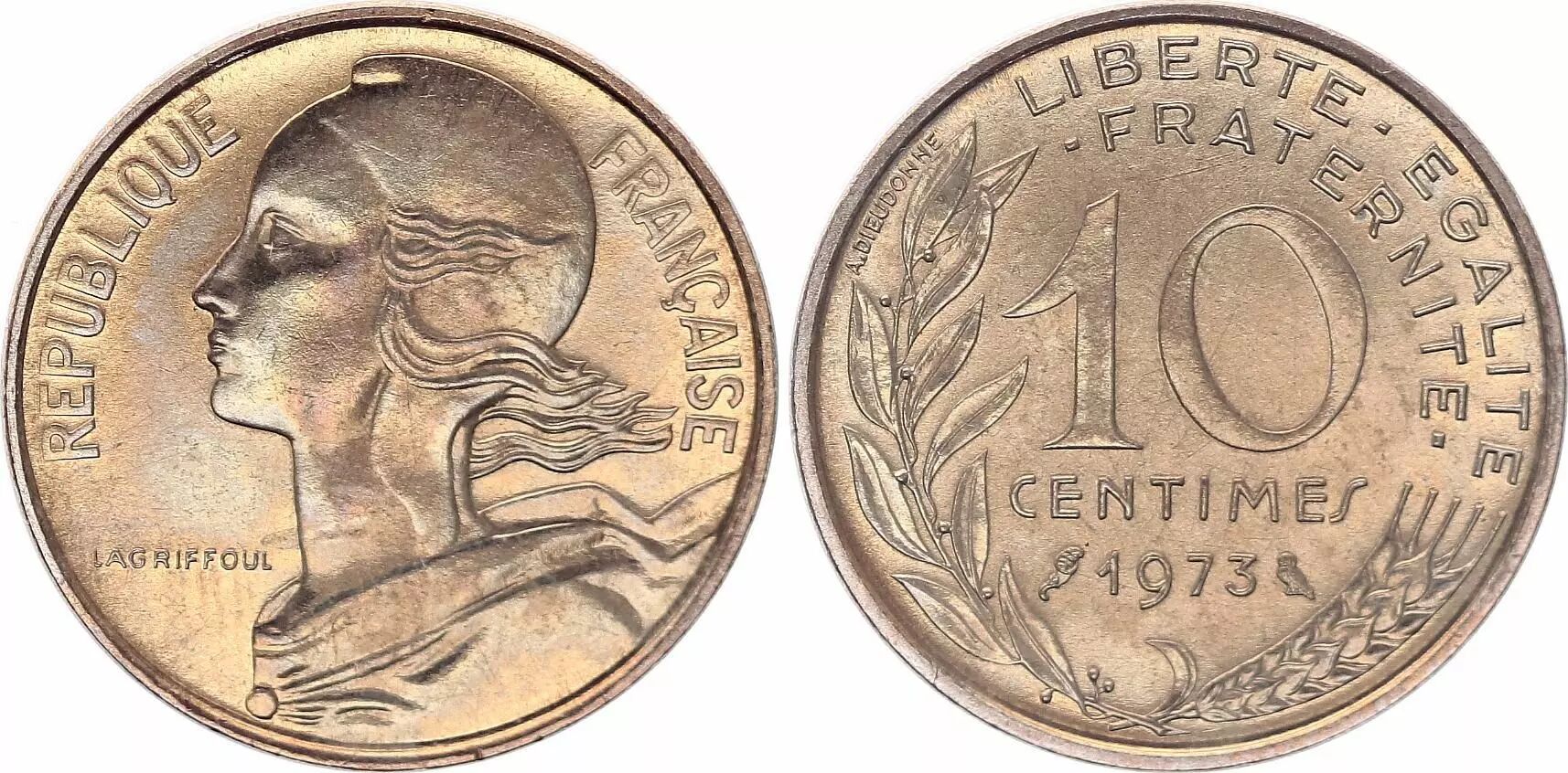 Le revers de la pièce met en scène un épi de blé, symbole d'abondance et de prospérité, ainsi qu'une branche d'olivier, représentant la paix. Ces éléments floraux encadrent la valeur faciale de "10 CENTIMES". La devise républicaine "LIBERTE - EGALITE - FRATERNITE" est inscrite en arc de cercle autour de ces motifs. L'année d'émission, 1973, figure également sur cette face, ainsi que le nom du graveur, Adrien Dieudonné.