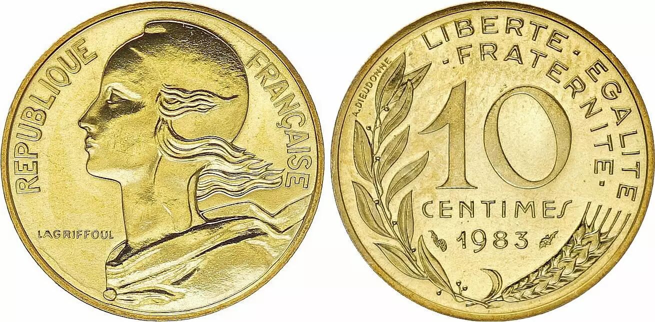 Cette pièce de 10 centimes, frappée en France en 1983, est issue d'un coffret Fleur de Coin (FDC). Elle est composée d'un alliage de bronze et d'aluminium.