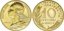 Sur le revers, on retrouve un épi de blé et une branche d'olivier, symboles de prospérité et de paix, entourant la valeur faciale de "10 CENTIMES". La devise républicaine "LIBERTE - EGALITE - FRATERNITE" est inscrite en arc de cercle. L'année d'émission, 1983, est encadrée par les différents marques d'atelier : la corne d'abondance, marque de la Monnaie de Paris, et un autre différent qui peut être une chouette (R. Joly, 1966-1974), un dauphin (E. Rousseau, 1975-1994), une abeille (P. Rodier, 1994-2000) ou un fer à cheval (G. Buquoy, 2001). La signature du graveur Adrien Dieudonné (A. DIEUDONNE) apparaît également sur cette face.