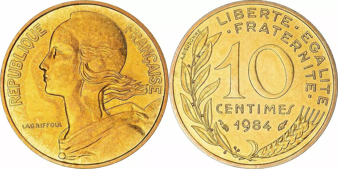 Cette pièce de 10 centimes, frappée en 1984, est une production française réalisée en bronze-aluminium. Elle pèse 3 grammes et possède un diamètre de 20 millimètres. La pièce est issue d'un coffret Fleur de Coin (FDC), ce qui indique qu'elle est dans un état de conservation exceptionnel, similaire à celui d'une pièce nouvellement frappée.