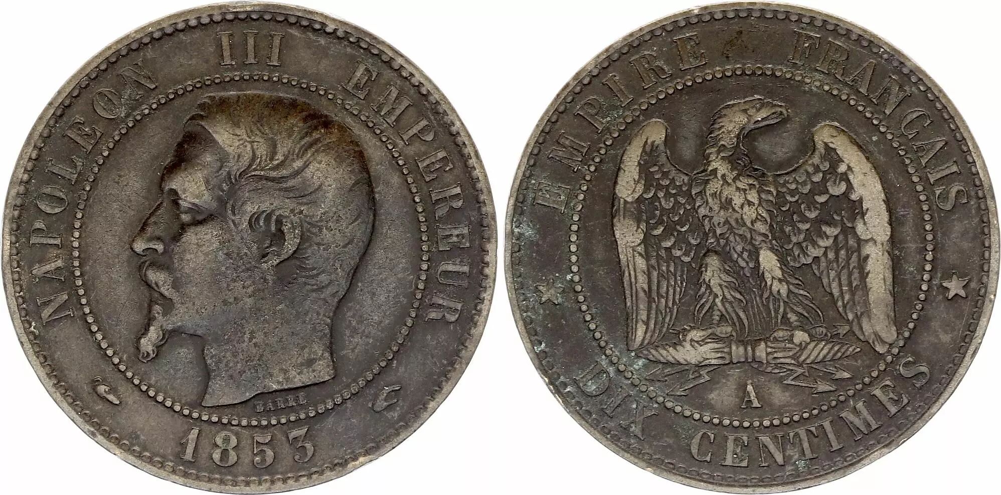 Coin France 10 Centimes Napoleon III - 1853 A Paris - Fine to VF - KM.771.1