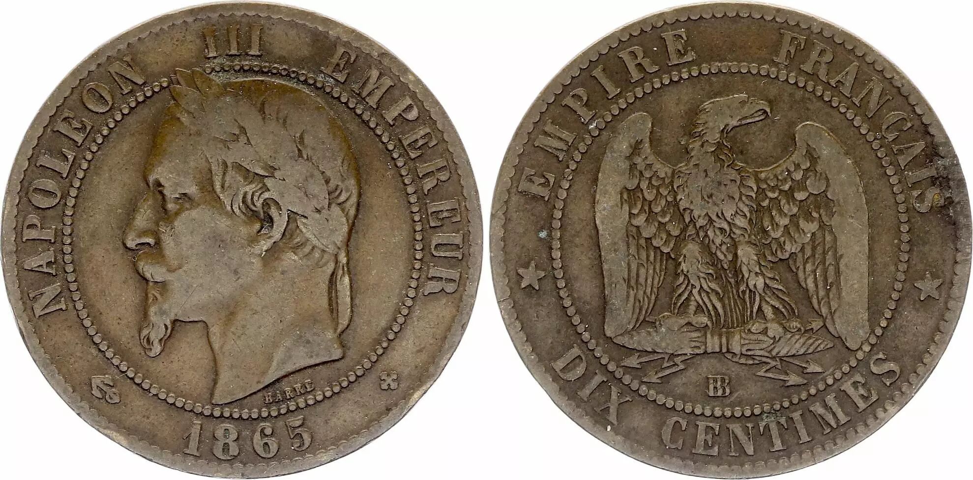 Home > > France 10 Centimes Napoleon III Laureate head - 1865 BB Strasbourg Fine to VF - KM.798.2
