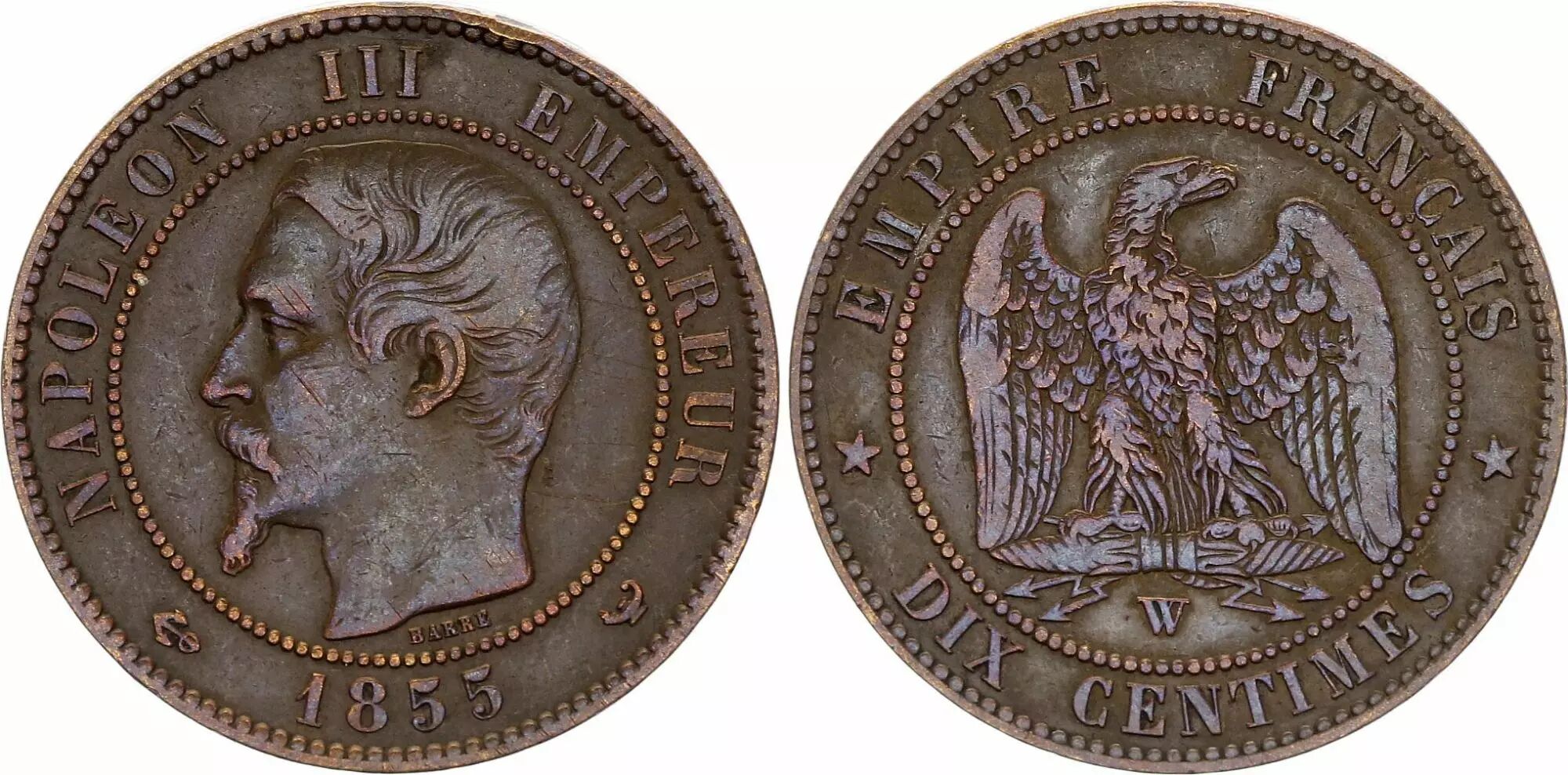 Home > > France 10 Centimes Napoleon III Nude head - 1855 W Lille