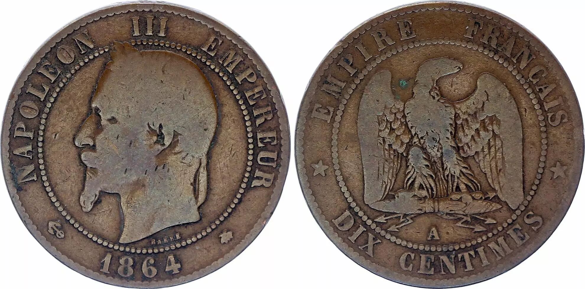 Pièce France 10 Centimes Napoléon III Tête laurée - 1864 A Paris - B +