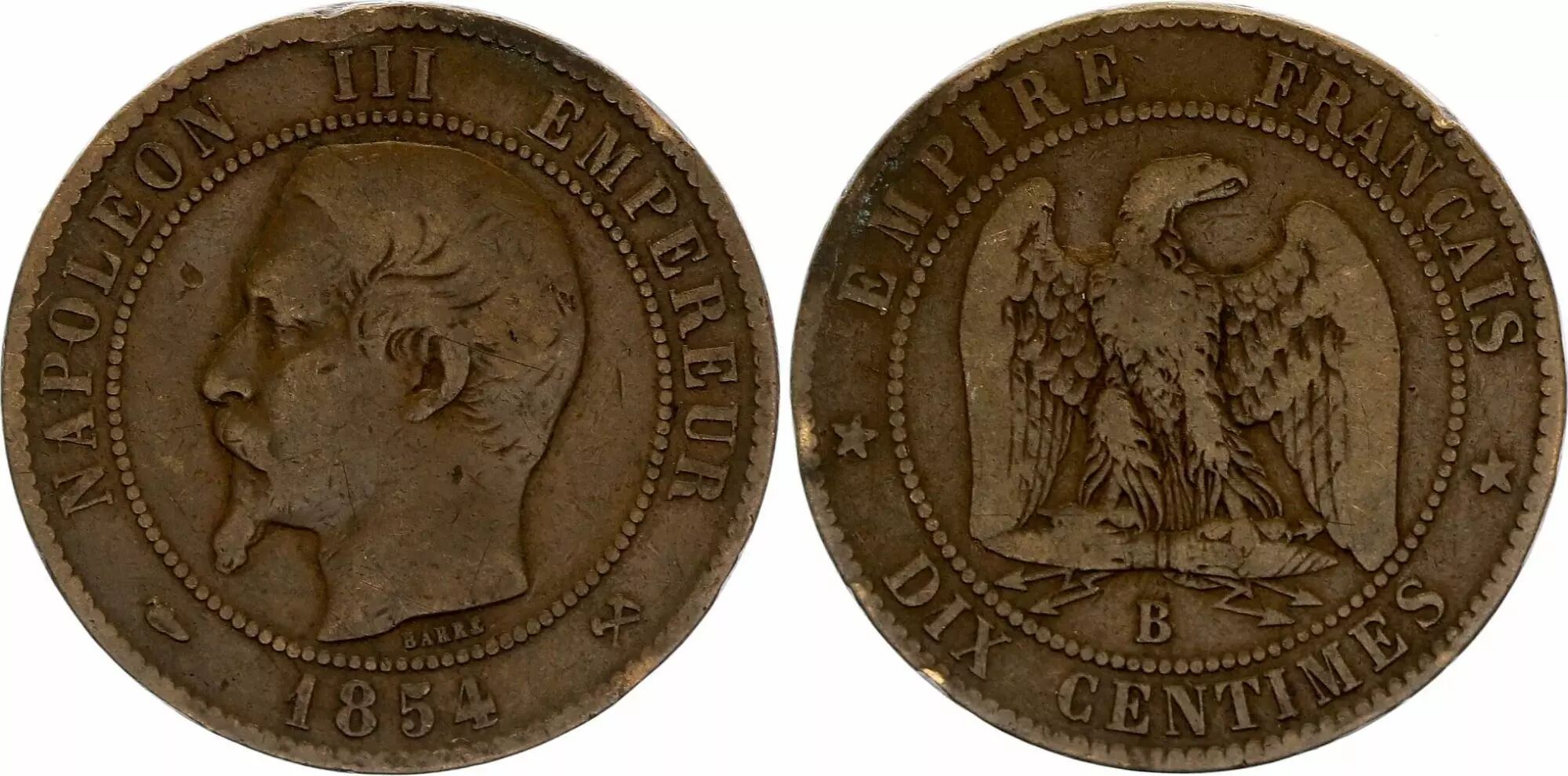 Pièce France 10 Centimes Napoléon III Tête nue - 1854 B Rouen