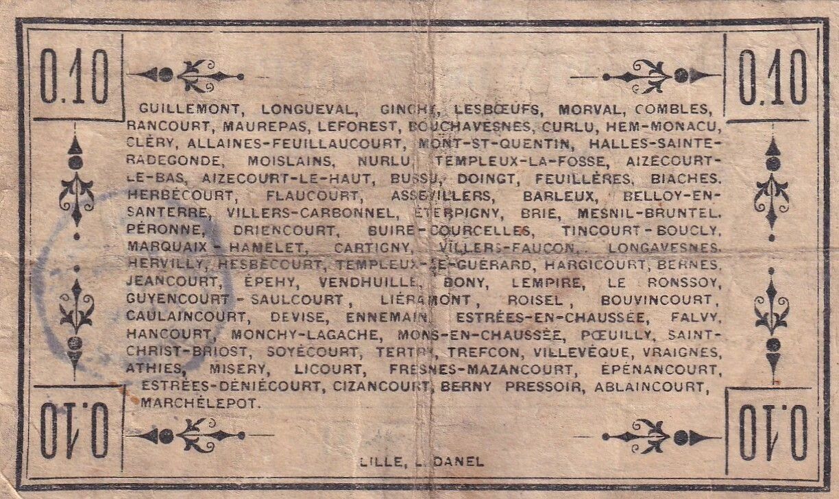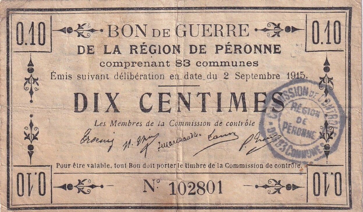 This note, issued in France, represents a war bond from the city of Péronne, dated September 2, 1915. Its face value is 10 centimes.