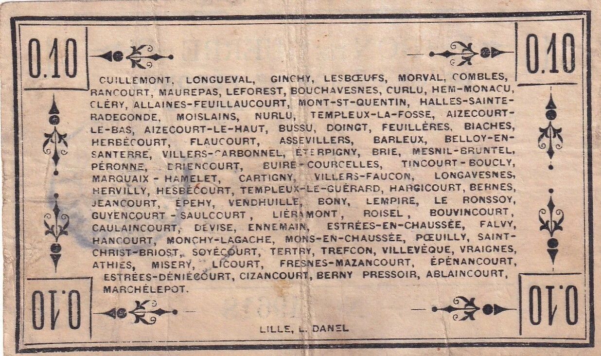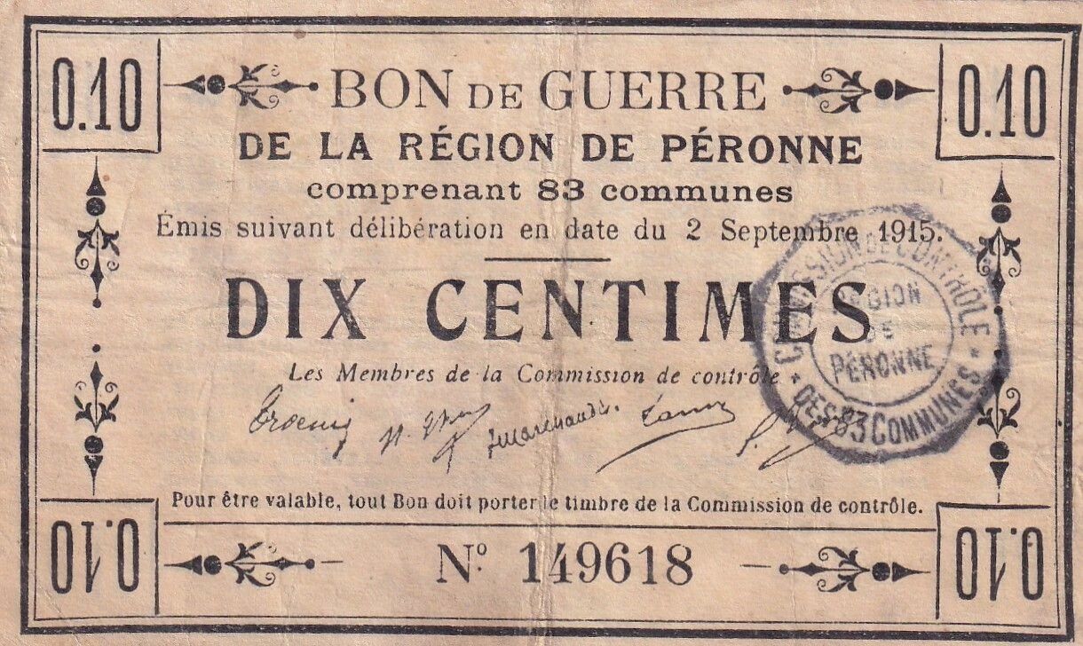 This type of war bond was issued locally during World War I due to the shortage of currencyDivision territoriale (Land) en Autriche et en Allemagne. It facilitated trade within the city of Péronne and its surroundings.