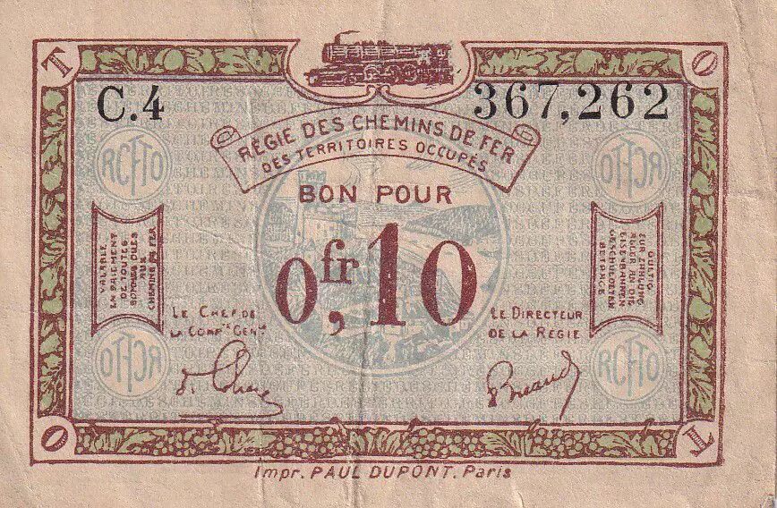 Banknote France 10 Centimes Regie des chemins de Fer - 1923 - Serial C.4 - F to VF - R.2