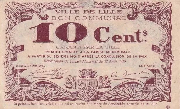 Ce billet de 10 centimes est un bon communal émis par la ville de Lille, en France, daté du 17 avril 1918. Il appartient à la Série G.