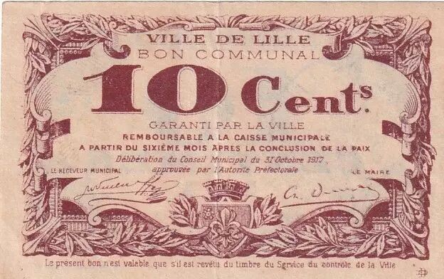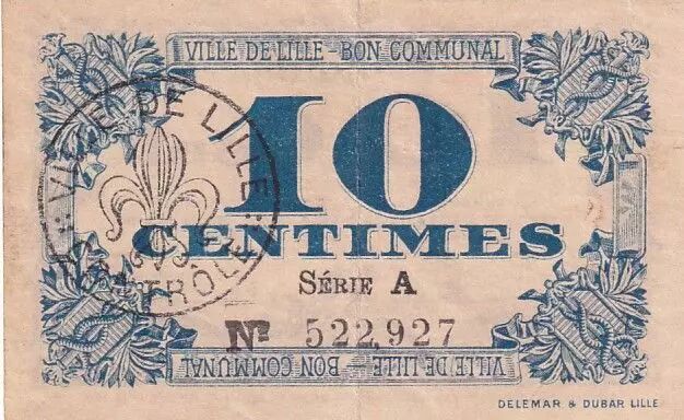 Ce billet communal de 10 centimes a été émis par la ville de Lille en France, daté du 31 octobre 1917, et fait partie de la Série A. Il s'agit d'un bon communal, une forme de monnaie de nécessité émise localement en période de crise ou de pénurie de monnaie.