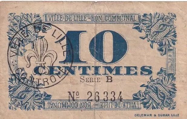 Ce billet de 10 centimes est un bon communal émis par la ville de Lille, en France, daté du 31 octobre 1917. Il appartient à la Série B. Ce type de bon était garanti par la ville et remboursable à la caisse municipale à partir du sixième mois suivant la conclusion de la paix.