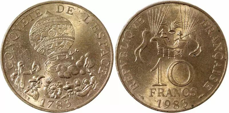 The obverse of the coin features a gas balloon basket carrying two passengers, symbolizing the pioneers of aerostation. The face value of "10 FRANCS" is clearly indicated, along with the mintmarks and the year "1983". The circular legend "RÉPVBLIQVE FRANÇAISE" identifies the issuing country. The engraver of this face is Daniel Ponce.