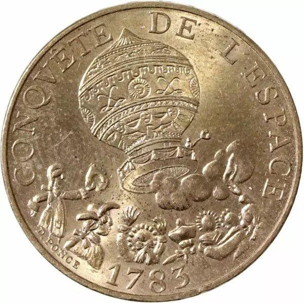 The reverse of the coin depicts a hot air balloon rising into the sky, soaring above a cheering crowd, evoking the enthusiasm and fascination generated by the first flights. The inscription "CONQVÊTE DE L'ESPACE" underscores the commemorative theme. The engraver's signature, "D.PONCE", is also present, as well as the year "1783", the date of the first balloon flight. Daniel Ponce is also the engraver of this face.