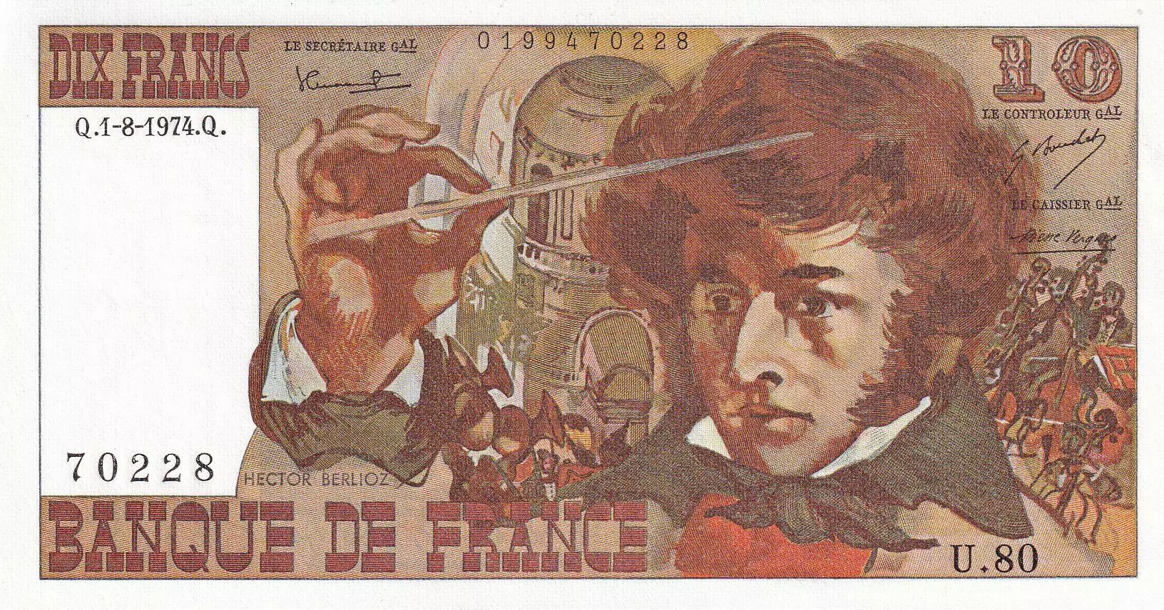 Accueil > Billets Français > Billets Banque de France > Billets 10 Francs > Berlioz type 1972 (1972-1978) > France 10 Francs - Berlioz - 01-08-1974 - Série U.80 - F.63.06