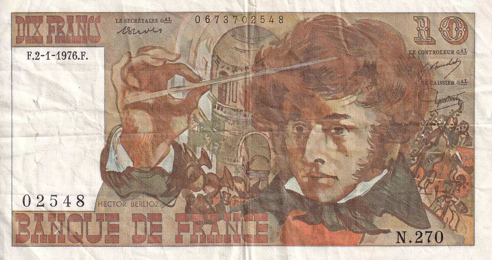 Home > French Banknotes > Bank of France Banknotes > 10 Francs > Berlioz Type 1972 (1972-1978) > France 10 Francs - Berlioz - 02-01-1976 - Serial N.270 - VF - P.150