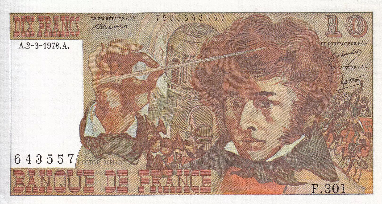 Home > French Banknotes > Bank of France Banknotes > 10 Francs > Berlioz Type 1972 (1972-1978) > France 10 Francs - Berlioz - 02-03-1978 - Serial F.301 - P.150