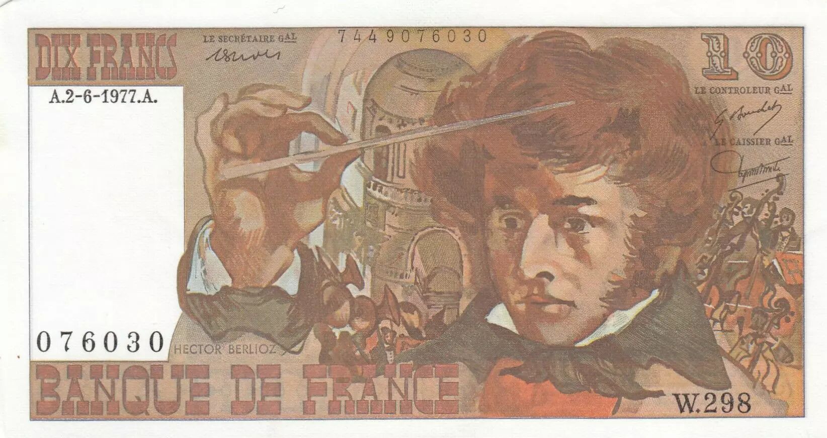 Banknote France 10 Francs - Berlioz - 02-06-1977 - Serial W.298
