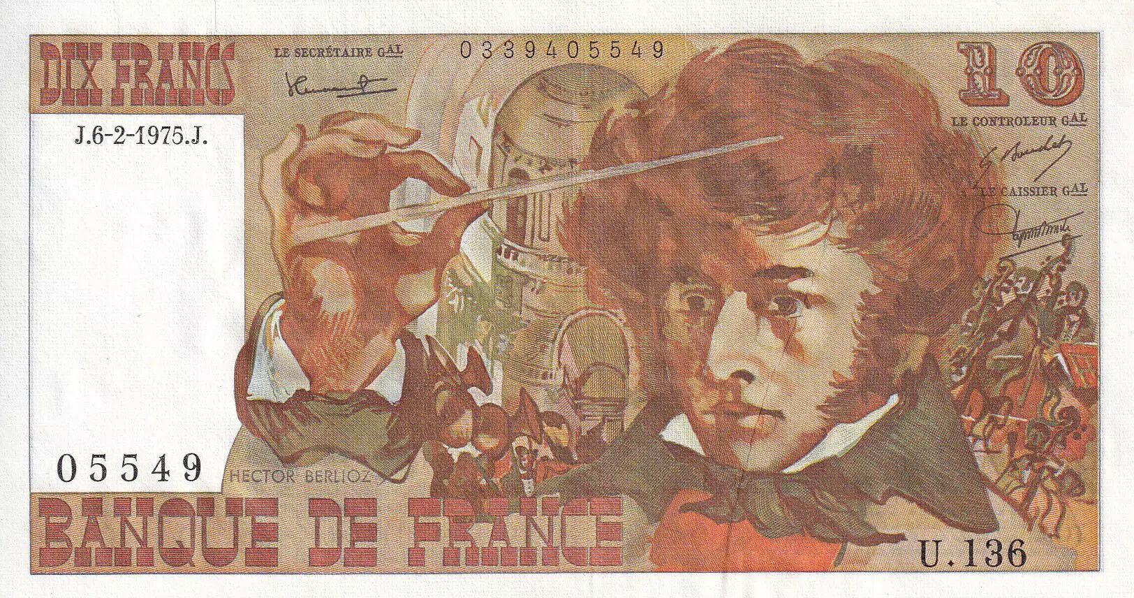 Banknote France 10 Francs - Berlioz - 06-02-1975 - Serial U.136 - P.150