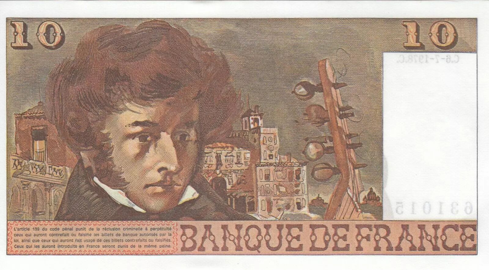 On the front of the banknote, there is a portrait of Hector Berlioz. The background of this side is composed of complex patterns and drawings that evoke the musical world and the era of Berlioz. The face value, "10 francs", is clearly indicated in numbers and letters. The mention "Banque de France" is also present, identifying the issuing institution.