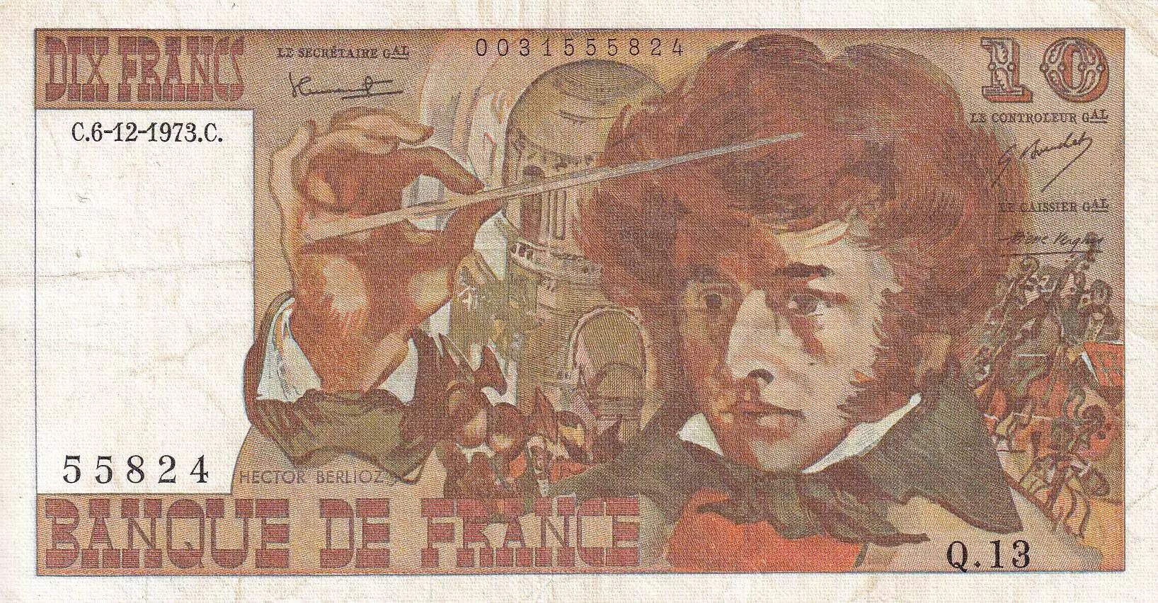 Home > French Banknotes > Bank of France Banknotes > 10 Francs > Berlioz Type 1972 (1972-1978) > France 10 Francs - Berlioz - 06-12-1973 - Serial Q.13 - VF - P.150