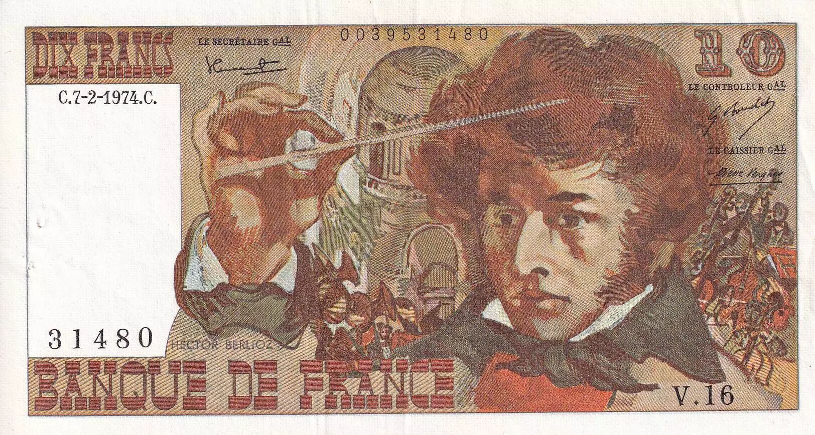 Home > French Banknotes > Bank of France Banknotes > 10 Francs > Berlioz Type 1972 (1972-1978) > France 10 Francs - Berlioz - 07-02-1974 - Serial V.16 - XF - P.150