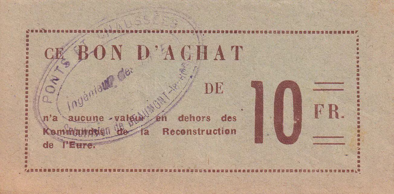 Billet France 10 Francs - Bon des Kommandos de la Reconstruction de l'Eure - TTB+