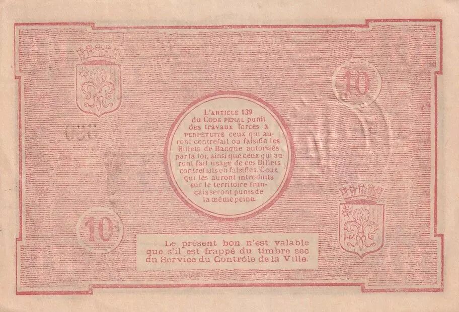 The reverse of the banknote contains a legal warning reproducing article 139 of the Penal Code, which stipulates the penalties incurred for counterfeiting or falsifying banknotes, as well as for their use or introduction into French territory. It is specified that the banknote is only valid if it is stamped with the dry stamp of the City's Control Service, adding a security measure to authenticate the banknote. The printer is mentioned again: "Imprimerie L. Danel, Lille, France".