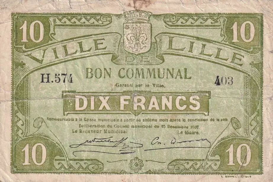 This 10 Francs note is a municipal bond issued by the City of Lille, dated December 15, 1917, and belongs to series H 574, bearing the number 403.