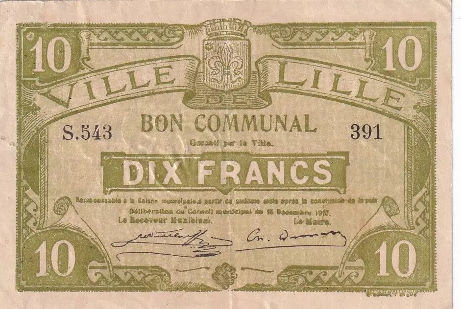 This 10 franc banknote, issued by the City of Lille, dates from December 15, 1917. It is a municipal bond, guaranteed by the city itself, and is part of the S 543 series, bearing the number 391.
