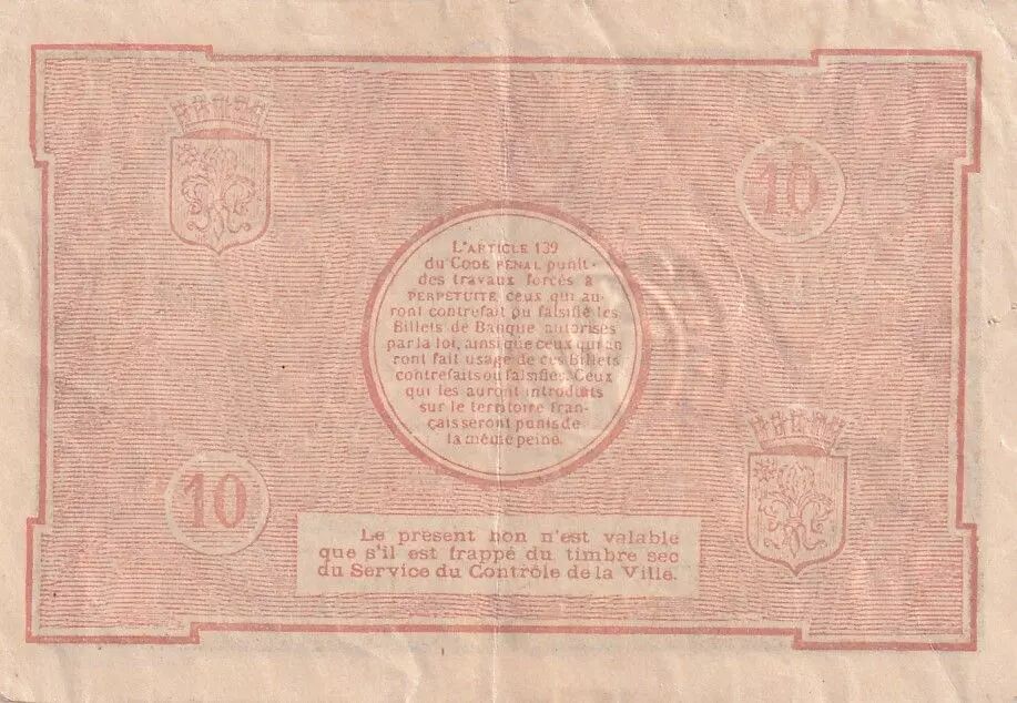 The back of the banknote warns against counterfeiting, citing Article 139 of the Penal Code, which provides for forced labor for life for those who counterfeit or falsify banknotes authorized by law, as well as for those who use or introduce such counterfeit banknotes on French territory. It is specified that the bond is only valid if it is stamped with the dry stamp of the City's Control Service.