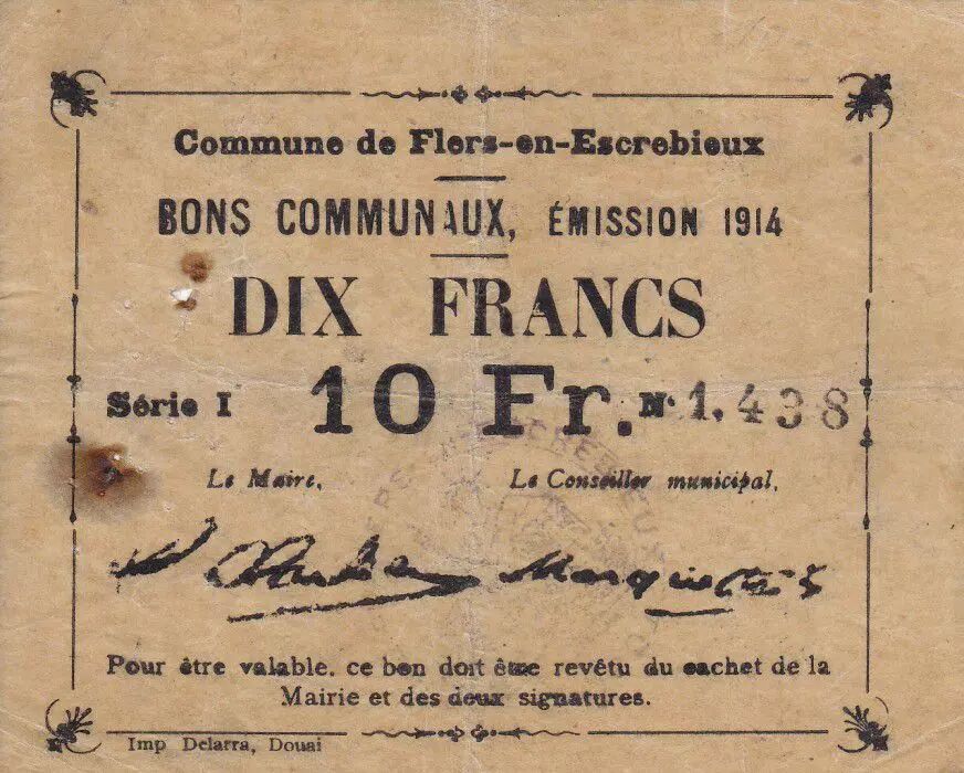 Billet France 10 Francs Flers-En-Escrebieux Commune - 1914