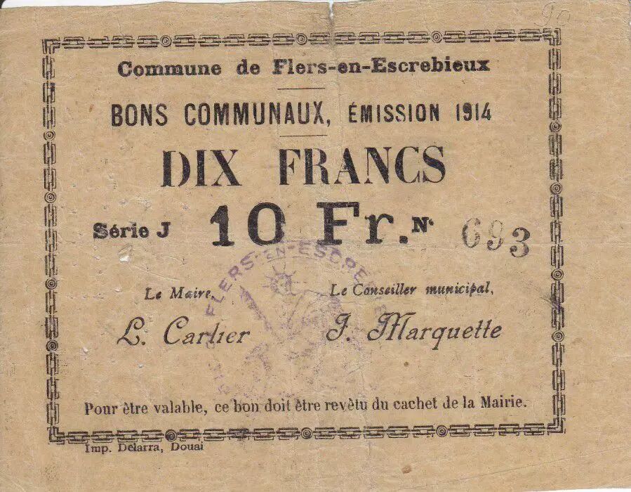 Billet France 10 Francs Flers-En-Escrebieux Commune - 1914