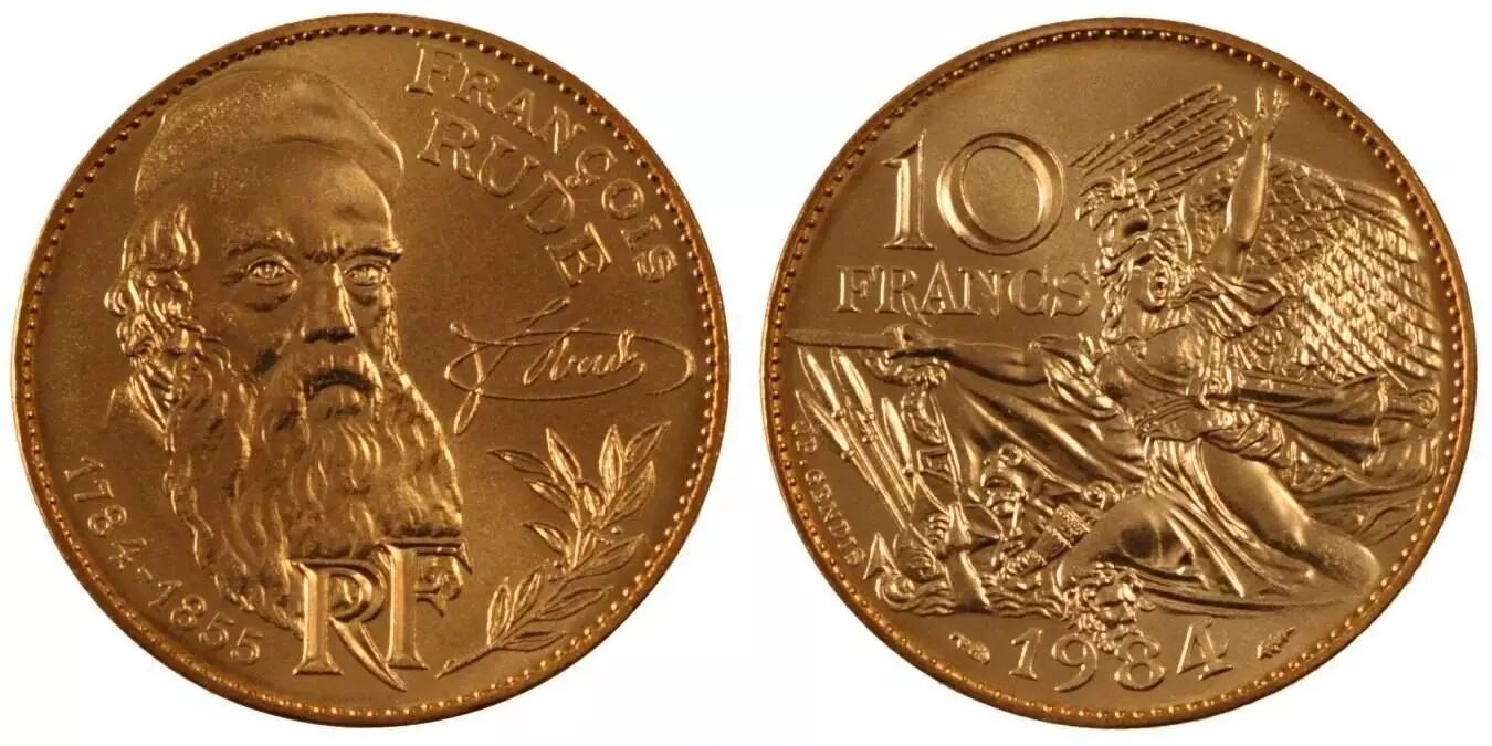 Cette pièce commémorative de 10 francs, frappée en 1984, rend hommage à François Rude à l'occasion du bicentenaire de sa naissance (1784-1984). Elle est composée d'un alliage de cuivre, d'aluminium et de nickel, pèse 10 grammes et présente un diamètre de 26 millimètres. Cette pièce est issue de coffret FDC (Fleur de Coin).