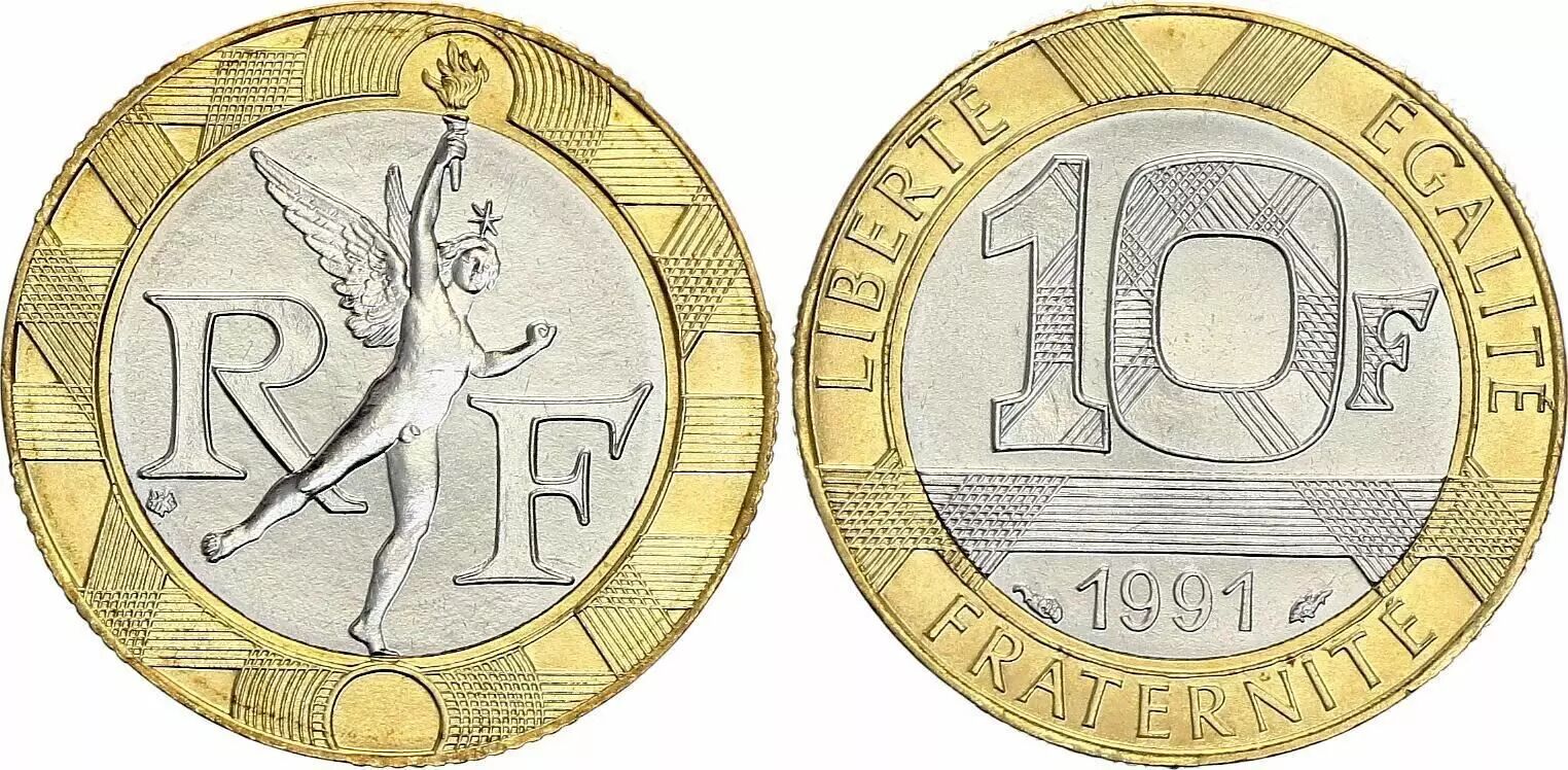This French coin was minted in 1988. It has a face value of 10 francs and comes from a Fleur de Coin (FDC) set. It is of Brilliant Uncirculated (BU) quality.
