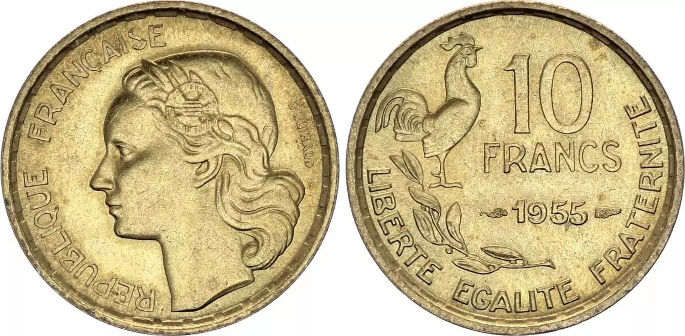 This coin is a coin of the French Republic, with a face value of 10 francs. It was minted in 1955.