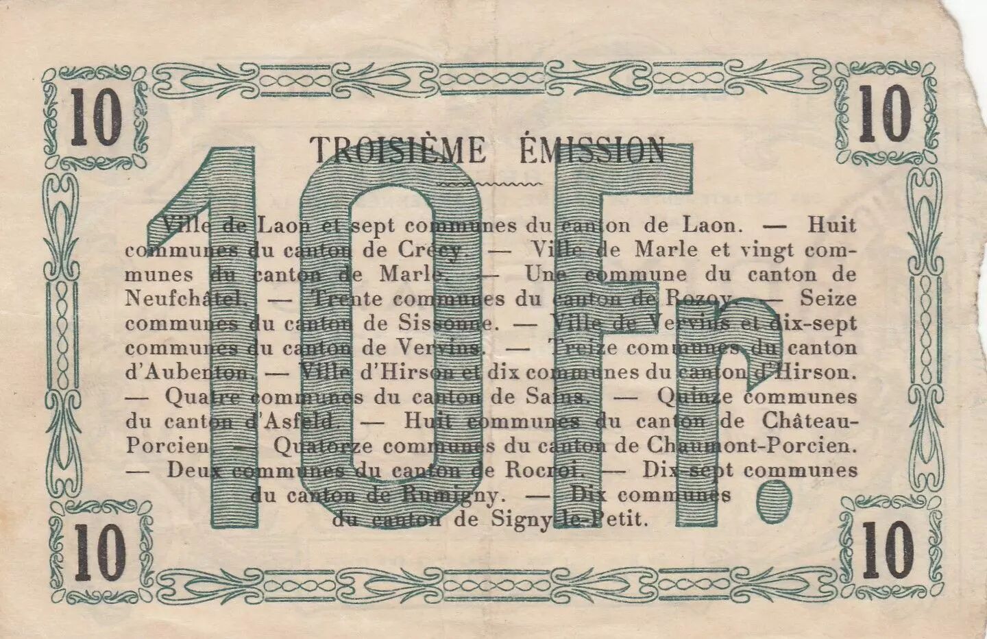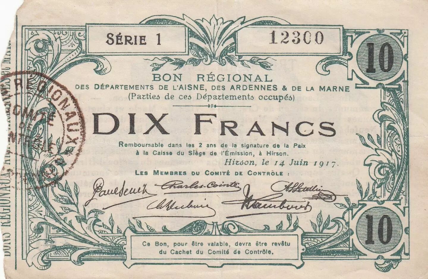 Banknote France 10 Francs - Hirson - Regional Coupon - 14-06-1917 - Serial 1