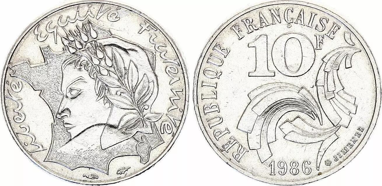 This coin is a 10 Franc coin, minted in France in 1986. It is commonly called "Jimenez" in reference to the engraver who designed its motif.
