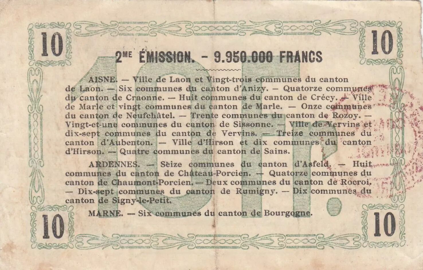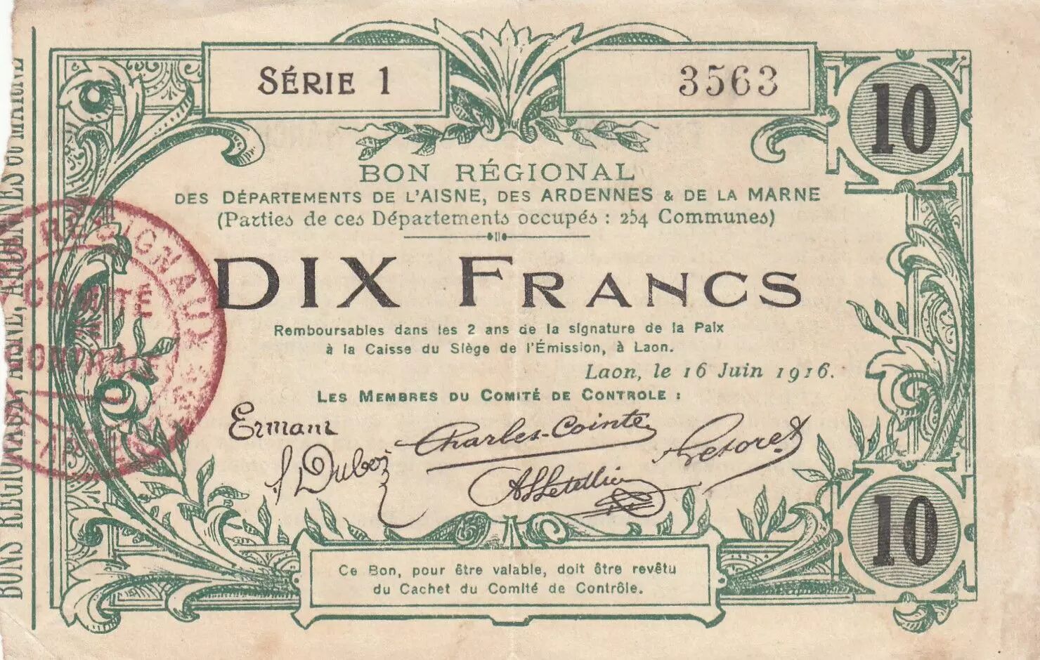 Home > > France 10 Francs - Laon - Regional Coupon - 16-06-1916 - Serial 1