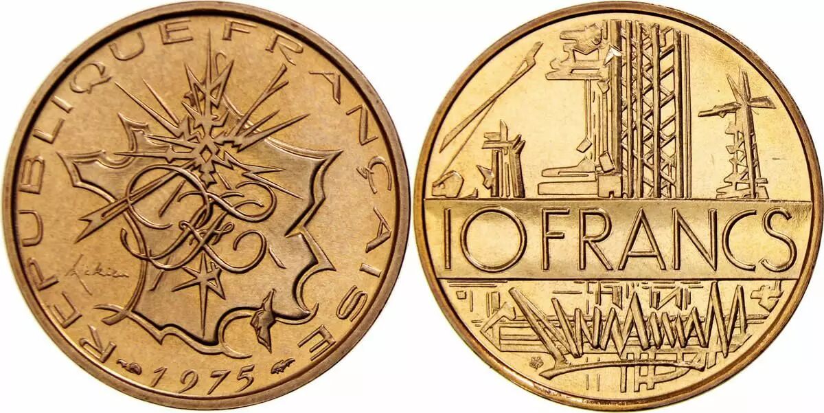 Cette pièce de 10 francs, frappée en 1975, est une création de Georges Mathieu. Elle est composée d'un alliage de cuivre, d'aluminium et de nickel, lui conférant une couleur distinctive.