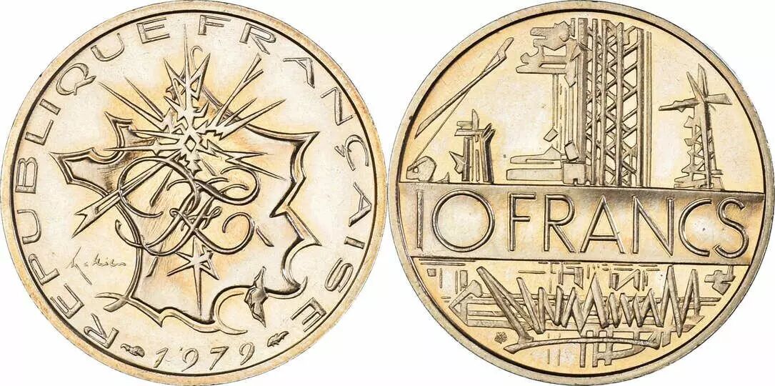 Le revers de la pièce illustre des représentations stylisées d'une France industrielle, avec des formes évoquant des grues, des pylônes et des bâtiments. L'inscription "10 FRANCS" indique la valeur nominale de la pièce.