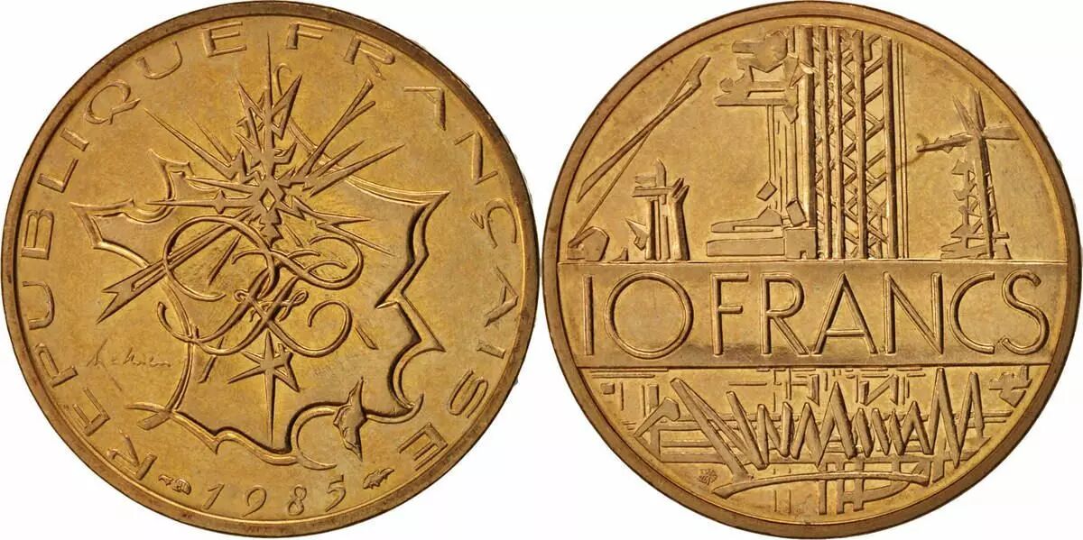 La pièce de 10 francs Mathieu 1985 tranche B est une monnaie française en cupronickel, issue de la série dessinée par le graveur Jean-Pierre Mathieu, caractérisée par un style moderne et épuré. Au droit, elle présente un profil stylisé de la République, entouré de la légende "République Française", et au revers, la valeur "10 FRANCS", l?année 1985, et un motif graphique représentant des formes géométriques entrelacées. La tranche B correspond à une des variantes existantes de cette pièce, identifiable par un listel fin ou une tranche alternée lisse et cannelée.