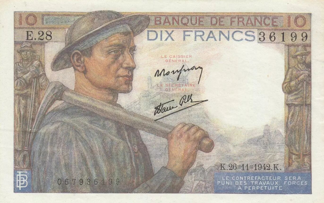 Banknote France 10 Francs - Miner - 26-11-1942 - Serial E.28
