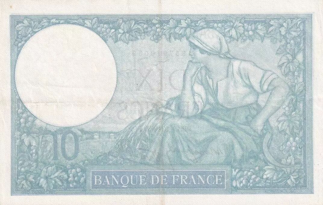 The inscriptions on the banknote are written in Latin. The words "BANQUE DE FRANCE" can be read at the top of the banknote, followed by the nominal value "DIX FRANCS". The value "10" is repeated twice on each side of the banknote. A legal warning is also inscribed, informing that "LE CONTREFACTEUR SERA PUNI DES TRAVAUX FORCES A PERPETUITE", emphasizing the seriousness of counterfeiting.