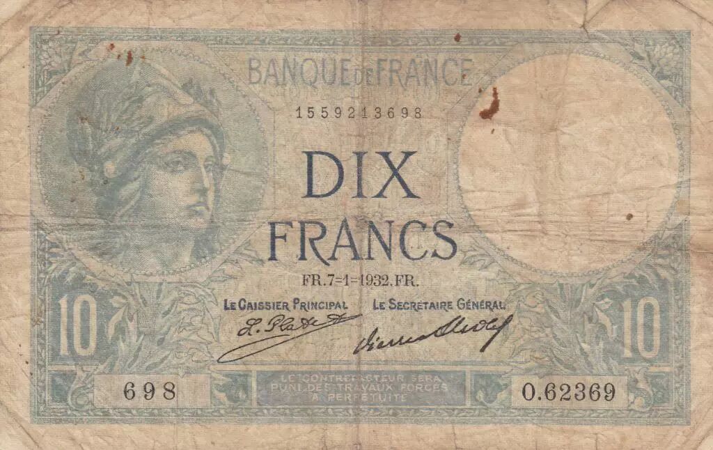 Banknote France 10 Francs Minerva - 07-01-1932 - Serial O.62369