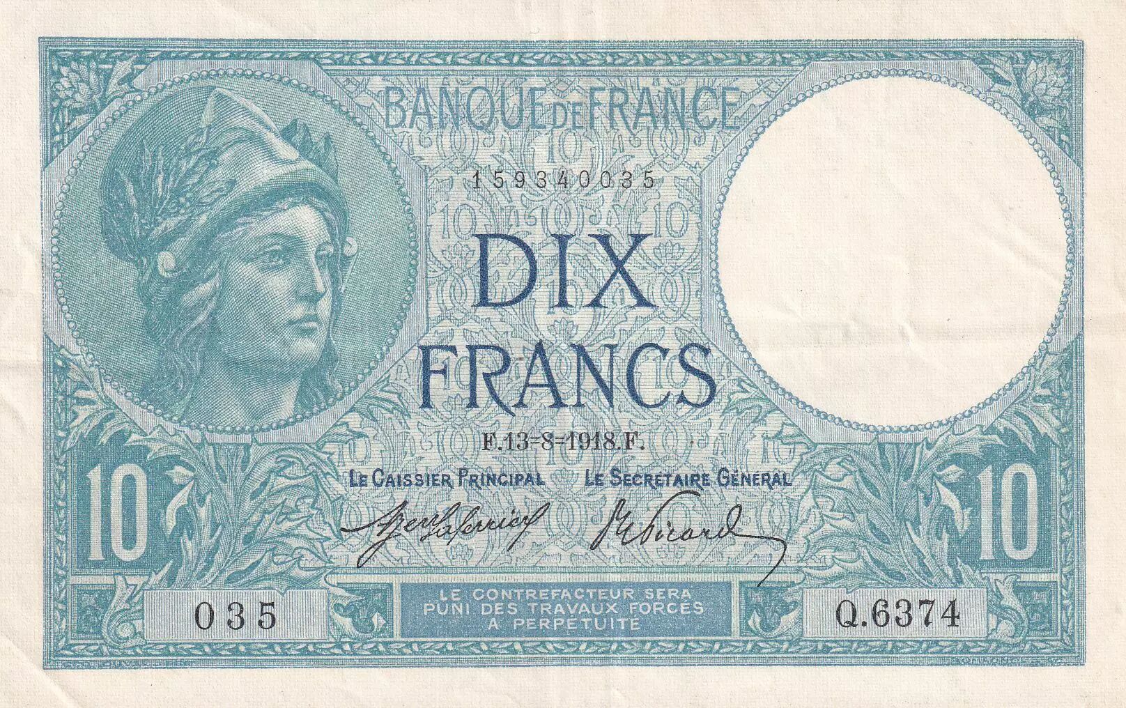 Banknote France 10 Francs - Minerva - 13-08-1918 - Serial Q.6374 - P.73