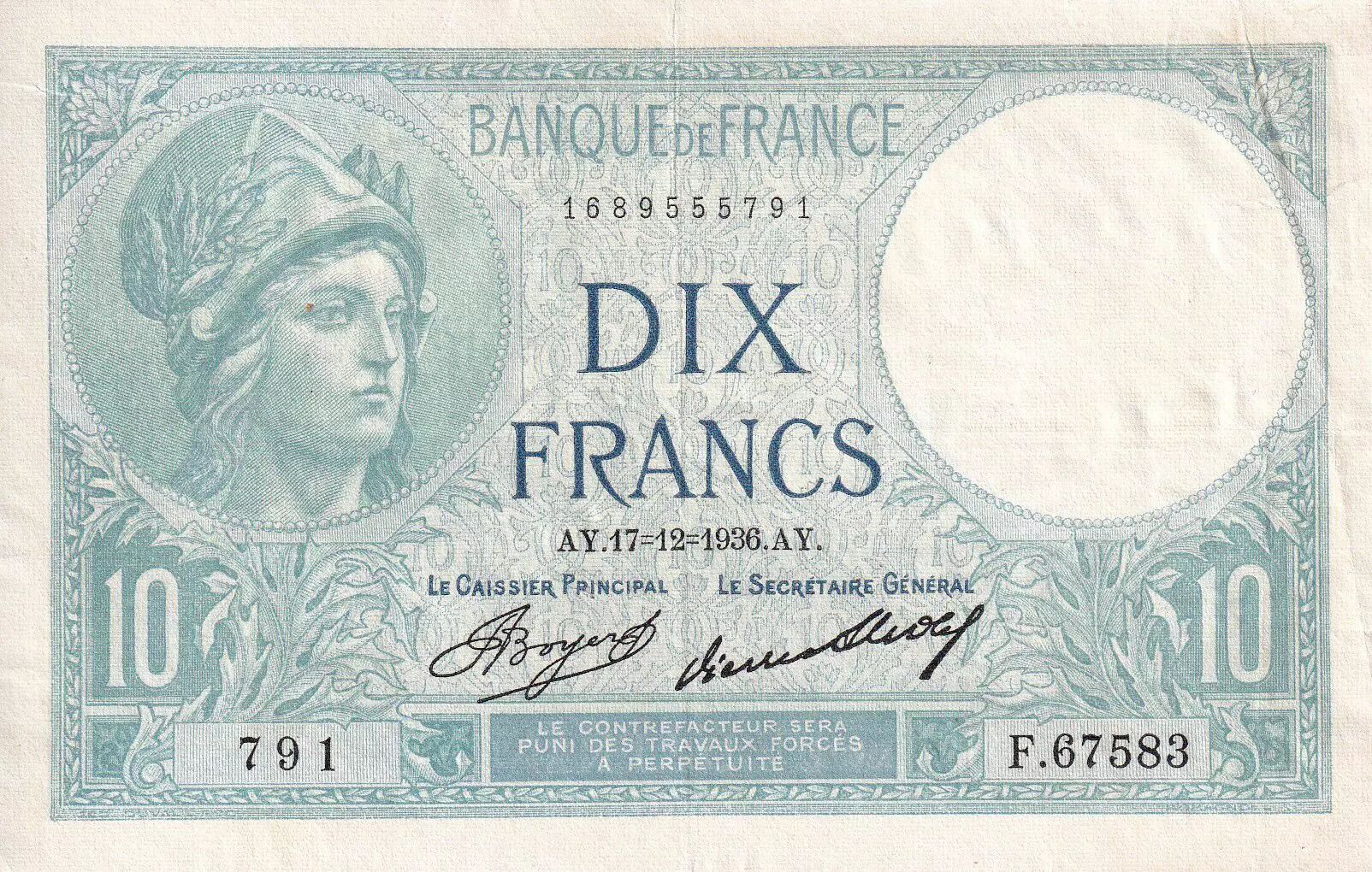 Banknote France 10 Francs - Minerva - 17-12-1936 - Serial F.67583 - P.73