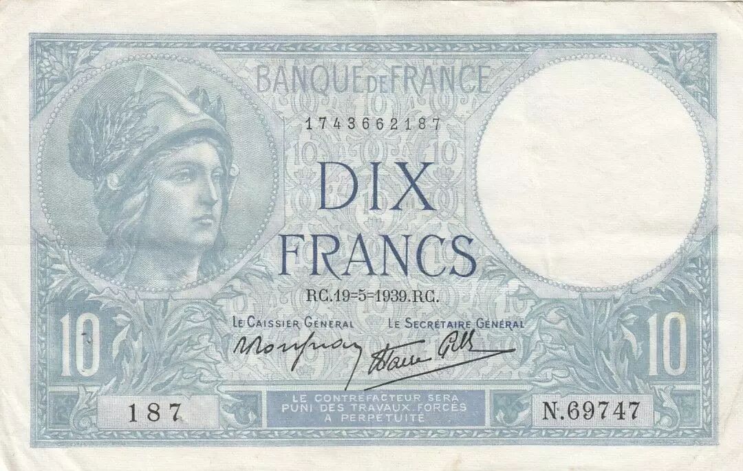 Home > > France 10 Francs Minerva - 19-05-1939 - Serial N.69747