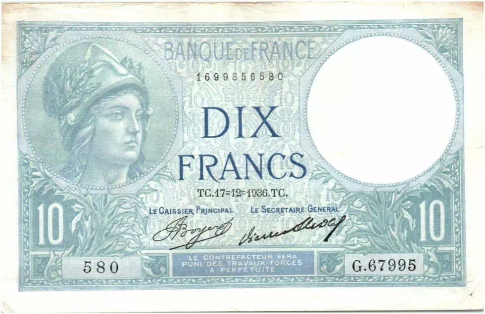 Banknote France 10 Francs Minerva - 1936