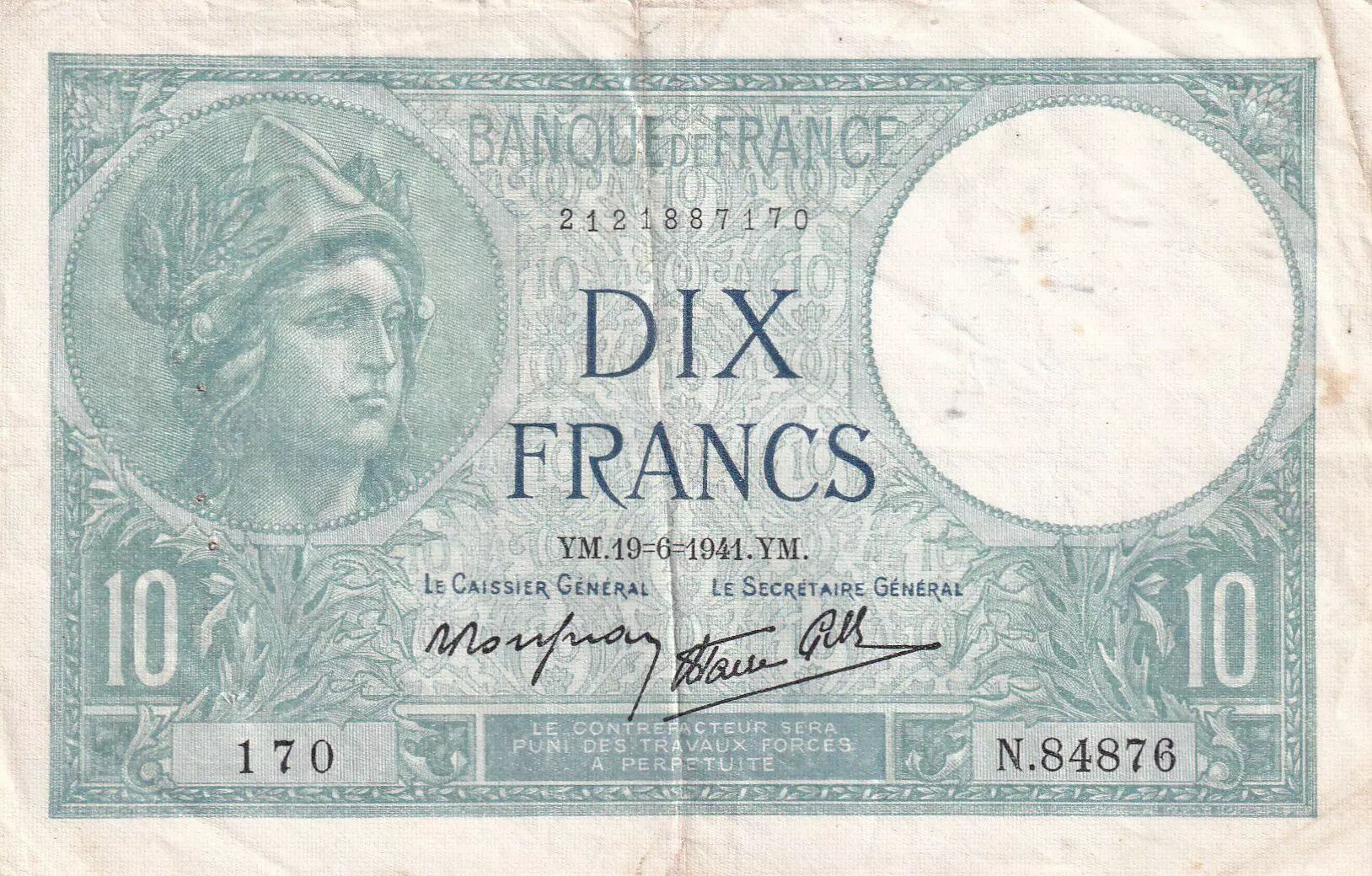 Home > French Banknotes > Bank of France Banknotes > 10 Francs > France 10 Francs Minerva - Various Years 1916-1942 - VF