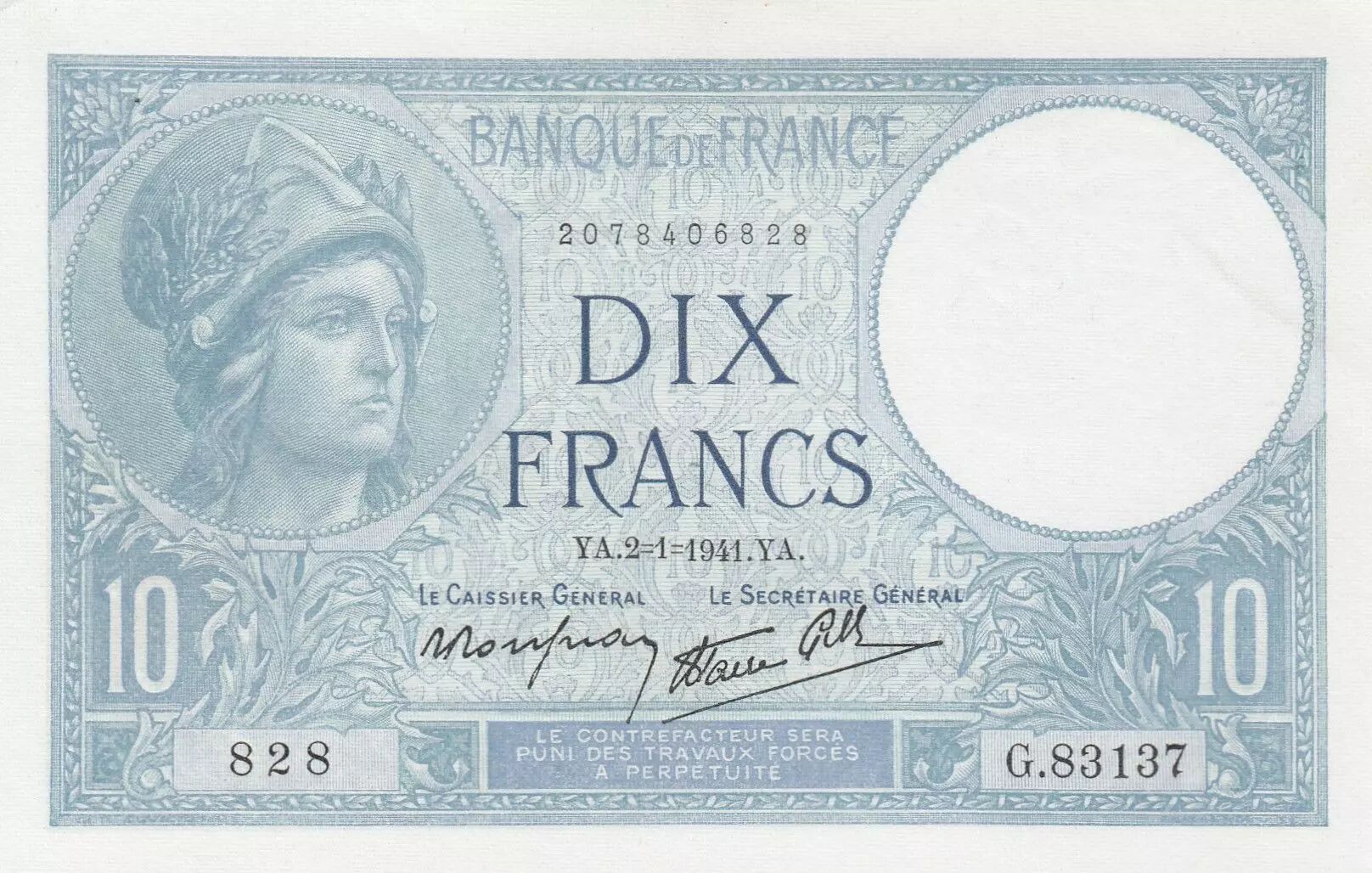 Billet France 10 Francs - Minerve - 02-01-1941 - Série G.83137